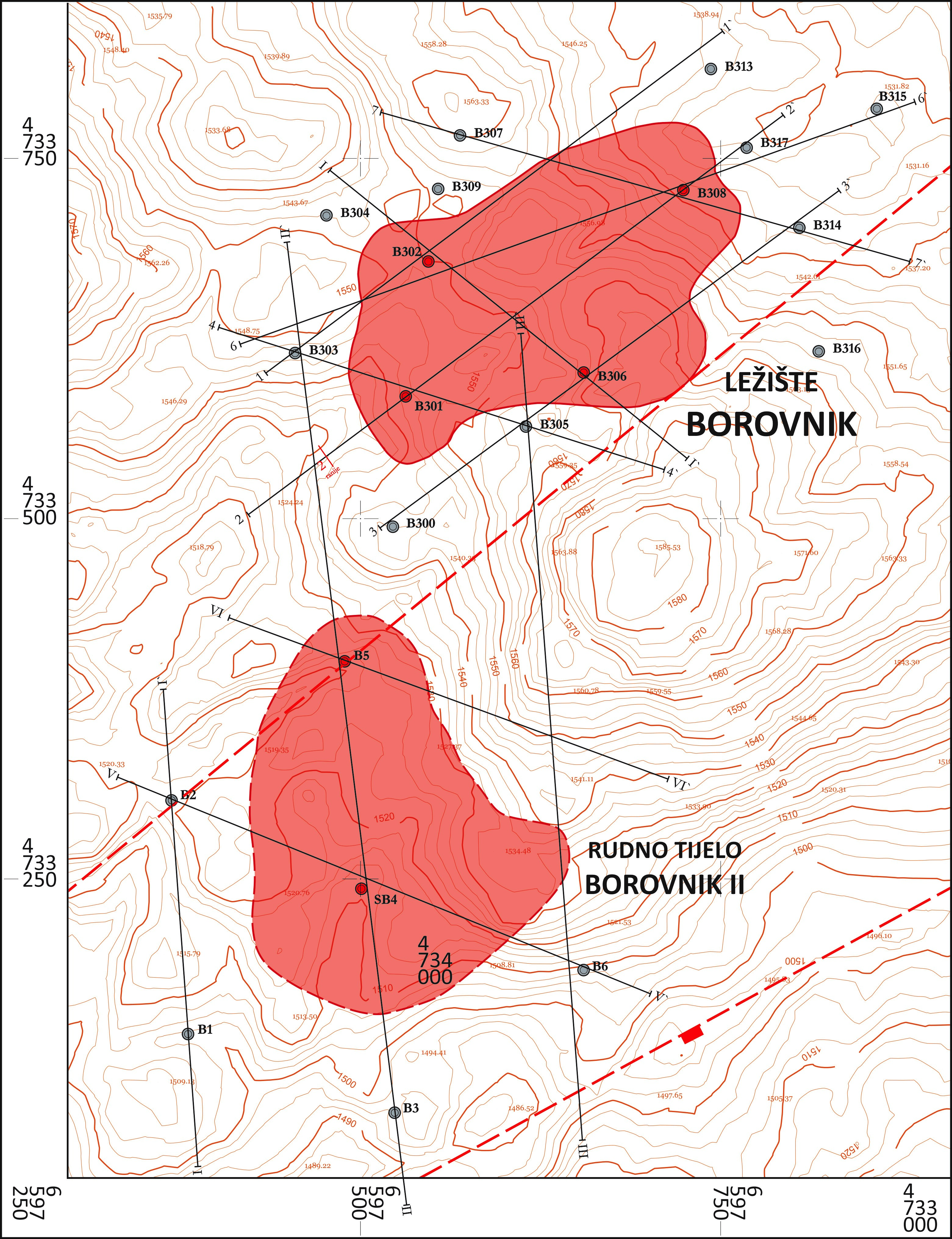 Situational plan of exploration wells and geological profiles in the area of the Borovnik deposit and the Borovnik II ore body